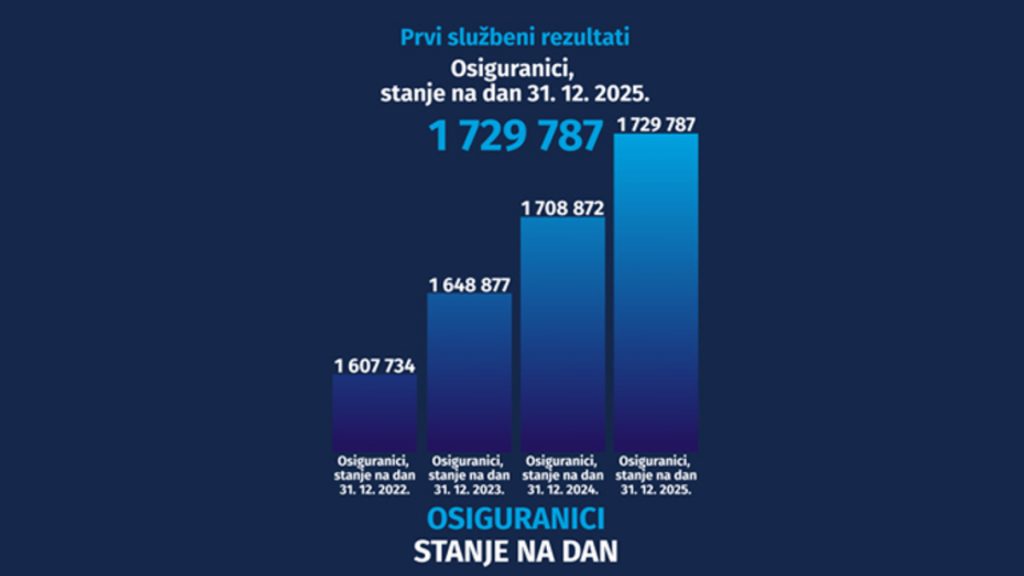 Prema najnovijim podacima Hrvatskog zavoda za mirovinsko osiguranje (HZMO) u prosincu 2025. u Hrvatskoj je bilo 1.729.787 osiguranika, što je u odnosu na 31. prosinca 2024. povećanje od 1,22 posto, odnosno 20.915 zaposlenih više.