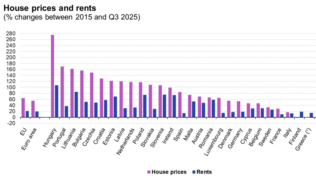 Kad se gleda stanje po pojedinim državama, cijene stambenih nekretnina rasle su brže od najamnina u 25 od 26 država članica za koje Eurostat ima dostupne potpune podatke. U tom razdoblju najveći skok je zabilježen u Mađarskoj (+275 posto).