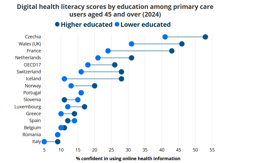 Podaci iz 17 zemalja OECD-a, uglavnom u Europi, pokazuju da je digitalna zdravstvena pismenost i dalje niska među korisnicima primarne zdravstvene zaštite u dobi od 45 i više godina. U 2024. godini taj je postotak iznosio 18 posto među onima s nižim stupnjem obrazovanja, u usporedbi s 26 posto među visokoobrazovanima. Podaci obuhvaćaju samo ovu dobnu skupinu.