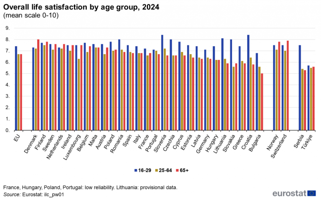 U 11 članica EU (Slovačkoj, Poljskoj, Francuskoj, Belgiji, Austriji, Švedskoj, Irskoj, Luksemburgu, Finskoj, Nizozemskoj i Danskoj) srednja dobna skupina (25-64) imala je najniže prosječno zadovoljstvo kvalitetom življenja, dok su u Danskoj, Finskoj i Nizozemskoj umirovljenici, tj. osobe starije od 65 godina, prijavile najveću zadovoljenost životom.