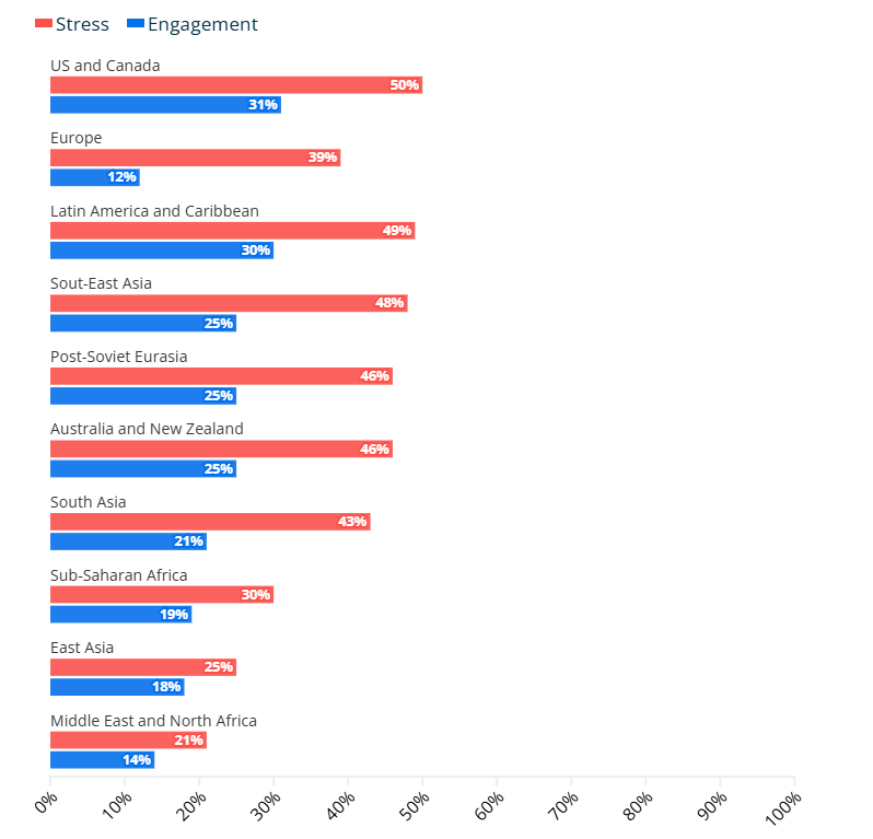 Globalna slika otkriva upečatljivu dihotomiju. Europa je manje pod stresom, ali i najmanje angažirana regija u cjelini (šestu godinu zaredom), dok se SAD i Kanada mogu pohvaliti najangažiranijom radnom snagom i istovremeno onom koja proživljava najviše stresa.