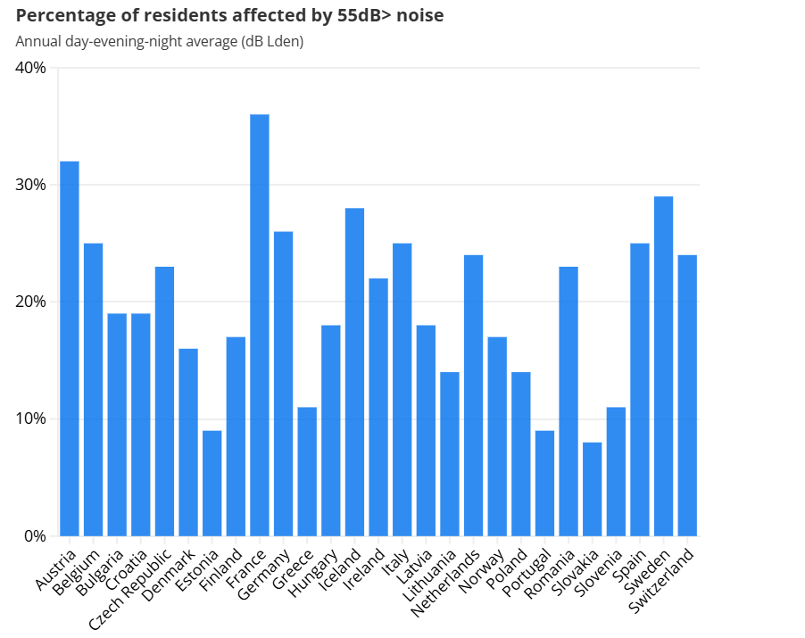Ako izuzmemo mikrodržave, Francuska prednjači u Europi kada je riječ o buci, s 36 posto građana koje uznemiravaju zvukovi iznad sigurnog praga – daleko ispred susjeda slične veličine poput Italije i Španjolske (25 posto) te Njemačke (26 posto). Promatrajući sve zemlje, Luksemburg (62 posto) i Cipar (58 posto) prednjače na ljestvici buke.