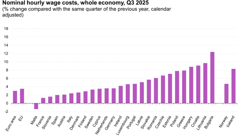 Europska statistička služba Eurostat u srijedu je objavila najnovije podatke o cijeni radne snage na području Europske unije u trećem kvartalu ove godine, po kojima je prosječna satnica radnika u eurozoni narasla za 3,3 posto godišnje, dok je na razini cijele EU rasla za 3,7 posto.