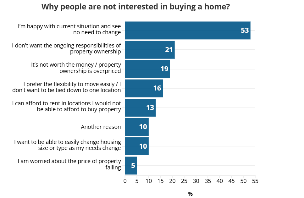 U prosjeku u 23 zemlje, više od polovice njih (53 posto) kaže da su zadovoljni svojom trenutnom situacijom i ne vide potrebu za kupnjom doma. Dodatnih 21 posto ne želi stalne odgovornosti koje dolaze s vlasništvom nad nekretninom. Gotovo svaki peti (19 posto) smatra da vlasništvo nad domom nije vrijedno novca ili da je nekretnina preskupa.