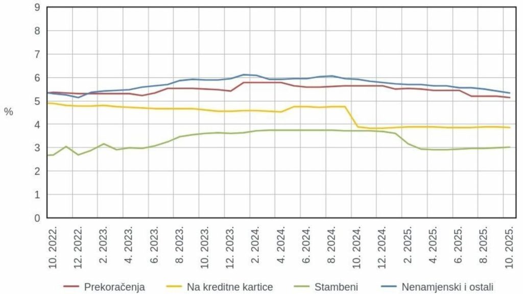 Kod glavnih kategorija kredita odobrenih nefinancijskim društvima prosjek kamatnih stopa iznosio je 2,97 posto za kratkoročne, a 3,8 posto za dugoročne kredite, pokazali su podaci za listopad 2025. godine.
