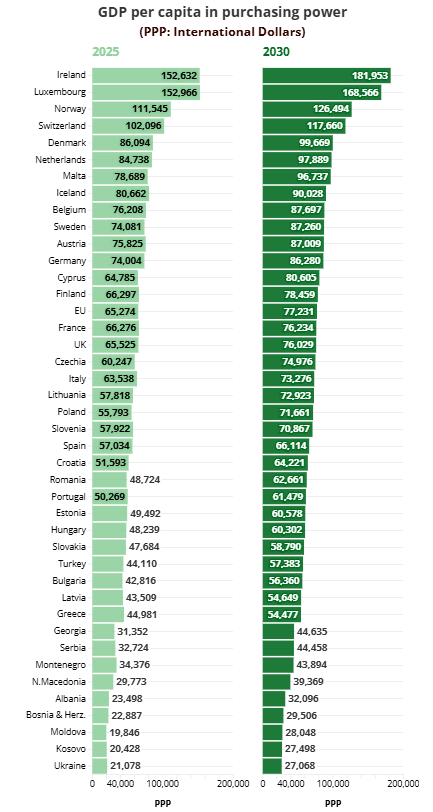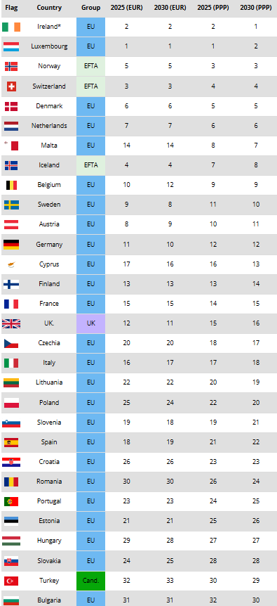 Među 41 europskom zemljom uključujući članice EU-a, zemlje kandidatkinje, članice EFTA-e i Ujedinjeno Kraljevstvo – Irska će prema projekcijama do 2030. godine zauzeti vrh tablice BDP-a po glavi stanovnika prema paritetu kupovne moći, istiskujući Luksemburg, koji je vodeći 2025. godine.