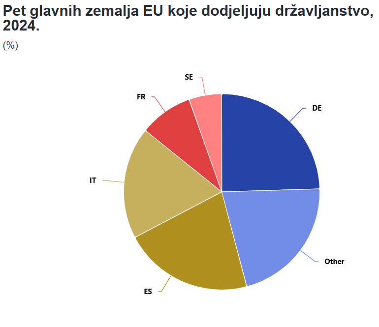 U 2024. godini, kao i u godini prije, sirijski državljani bili su najveća skupina novih građana EU-a, sa 110 100 novih dodijeljenih državljanstava. Marokanski državljani bili su druga najveća skupina, s 97 100 dodijeljenih državljanstava, a slijede ih Albanci (48 000). Slijede ih Turci (41 300, 3,5 posto) i Rumunji (39 900, 3,4 posto).