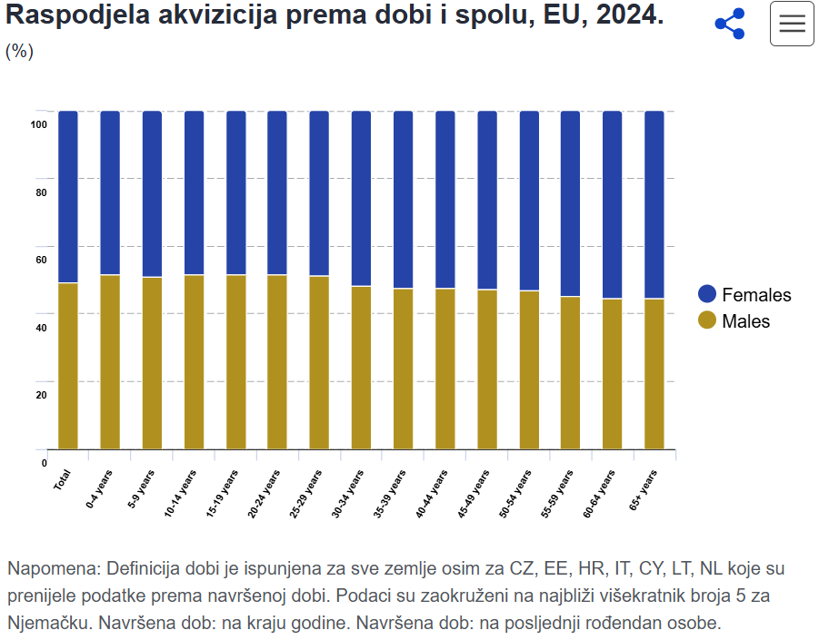 U 2024. godini, stjecanje državljanstva od strane žena nadmašilo je stjecanje državljanstva od strane muškaraca u svim zemljama EU osim 10 (Bugarska, Njemačka, Italija, Litva, Mađarska, Austrija, Poljska, Rumunjska, Slovačka, Švedska). Najveći udio stjecanja državljanstva od strane žena zabilježen je u Hrvatskoj (63,6 posto), dok je zemlja s najvećim udjelom stjecanja državljanstva od strane muškaraca bila Litva (58,9 posto).