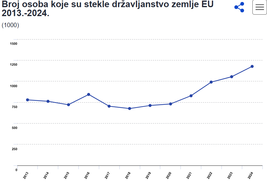 U 2024. godini gotovo 1,2 milijuna osoba steklo je državljanstvo zemlje članice Europske unije u kojoj žive, što predstavlja porast od 11,6 posto u odnosu na 2023. godinu, prema podacima Eurostata. Broj dodijeljenih državljanstava porastao je za 54,5 posto u usporedbi s 2014. godinom, kada ih je dodijeljeno ukupno 762 100.