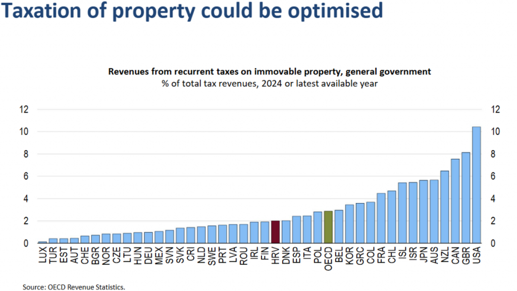 Potez kojeg sugerira OECD Hrvatskoj bilo bi uvođenje poreza na sve nekretnine. Smatraju da, kada velik broj ljudi plaća porez, onda se može smanjiti porezna osnovica. Uz to, napominju, da bi obiteljima s niskim primanjima plaćanje takvog poreza predstavljalo zapreku, pa bi trebalo razmotriti plaćanje u obrocima ili odgodu plaćanja poreza, dok se stan ne proda ili naslijedi.