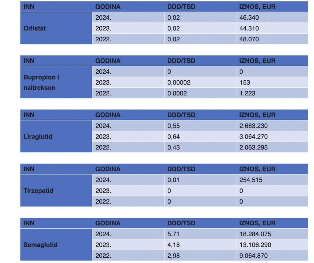 Istodobno, podaci o potrošnji pokazuju koliko je interes za ovu skupinu terapija narastao: potrošnja semaglutida od 2022. do 2024. rasla je prosječno oko 38 posto godišnje, a njegova financijska potrošnja skočila je s nešto više od devet milijuna eura u 2022. na više od 18 milijuna u 2024. godini.