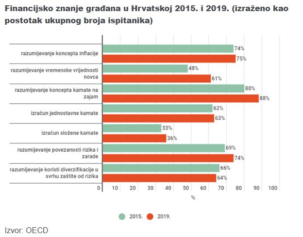 - Financijsko znanje u Hrvatskoj raste, primjerice, 2015. bilo je oko 60 %, 2019. oko 65 %, a 2023. oko 70 %.