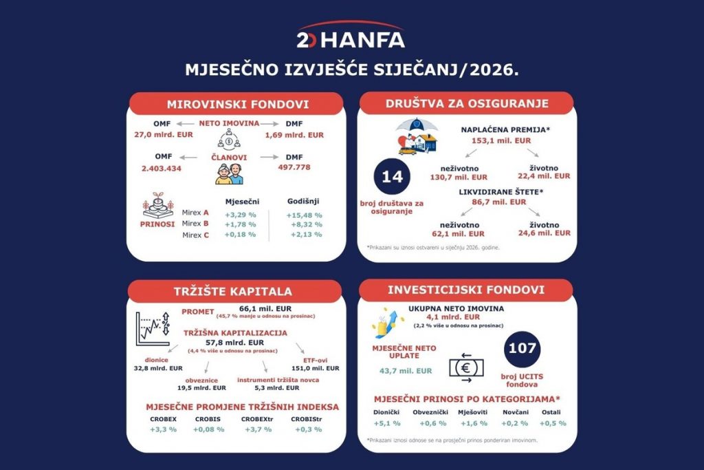 Hrvatska agencija za nadzor financijskih usluga (HANFA) objavila je mjesečnu statistiku za siječanj o imovini i trendovima ulaganja koji se odnose na obvezne i dobrovoljne mirovinske fondove, mirovinska osiguravajuća društva te društva za osiguranje, kao i za tržište kapitala.