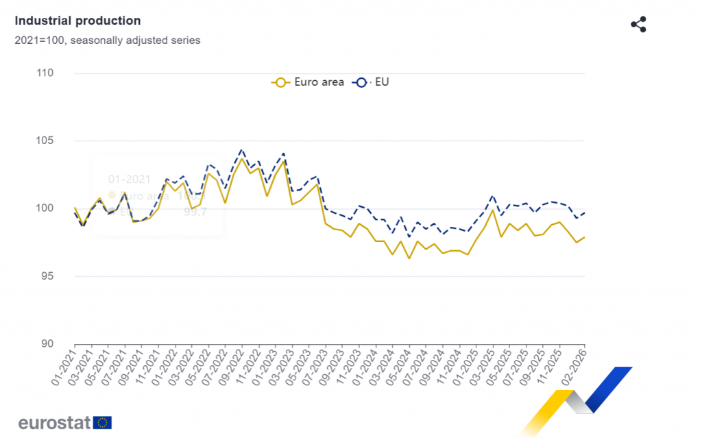 U veljači ove godine sezonski prilagođena industrijska proizvodnja u eurozoni i Europskoj uniji (EU) bila je 0,4 posto veća na mjesečnoj razini, pokazuju prve procjene Eurostata. Gledano godišnje međutim, industrijska proizvodnja u eurozoni pala je 0,6 posto te na razini EU-a 0,1 posto.