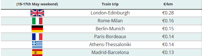 Madrid-Barcelona (tri sata i 15 minuta) čini se kao najbolja ponuda od svih, s cijenom po kilometru od samo 0,13 eura. Letite u istom razdoblju i očekujte da ćete platiti više nego dvostruko. Grčka također ima konkurentne cijene na relaciji sjever-jug Solun-Atena, koje iznose 69 eura za putovanje dugo 500 km koje traje nešto više od pet sati.