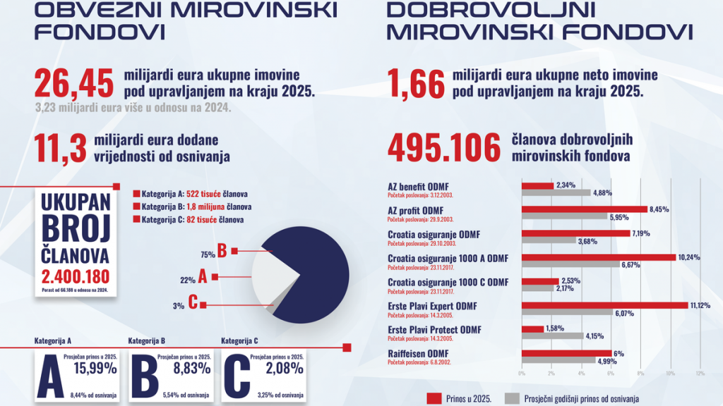 Na kraju 2025. godine obvezni mirovinski fondovi su pod svojim upravljanjem imali imovinu ukupne vrijednosti 26,5 milijardi eura. U odnosu na prethodnu godinu riječ je o povećanju od 3,2 milijarde eura ili 13,9 posto, izvijestili su na konferenciji za novinare predstavnici Udruge mirovinskih fondova (UMF).