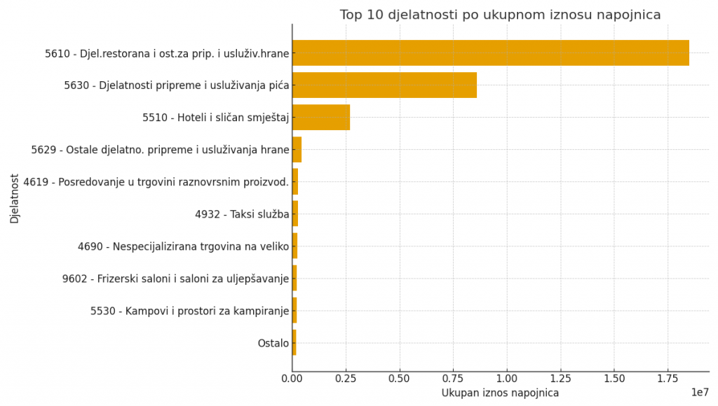 Najviše u ukupnom iznosu ostavljeno je u djelatnosti restorana i usluživanju hrane – više od 18 milijuna eura (18.499.064 eura). Prosječni iznos u ovoj djelatnosti nešto je manji od pet eura po računu.